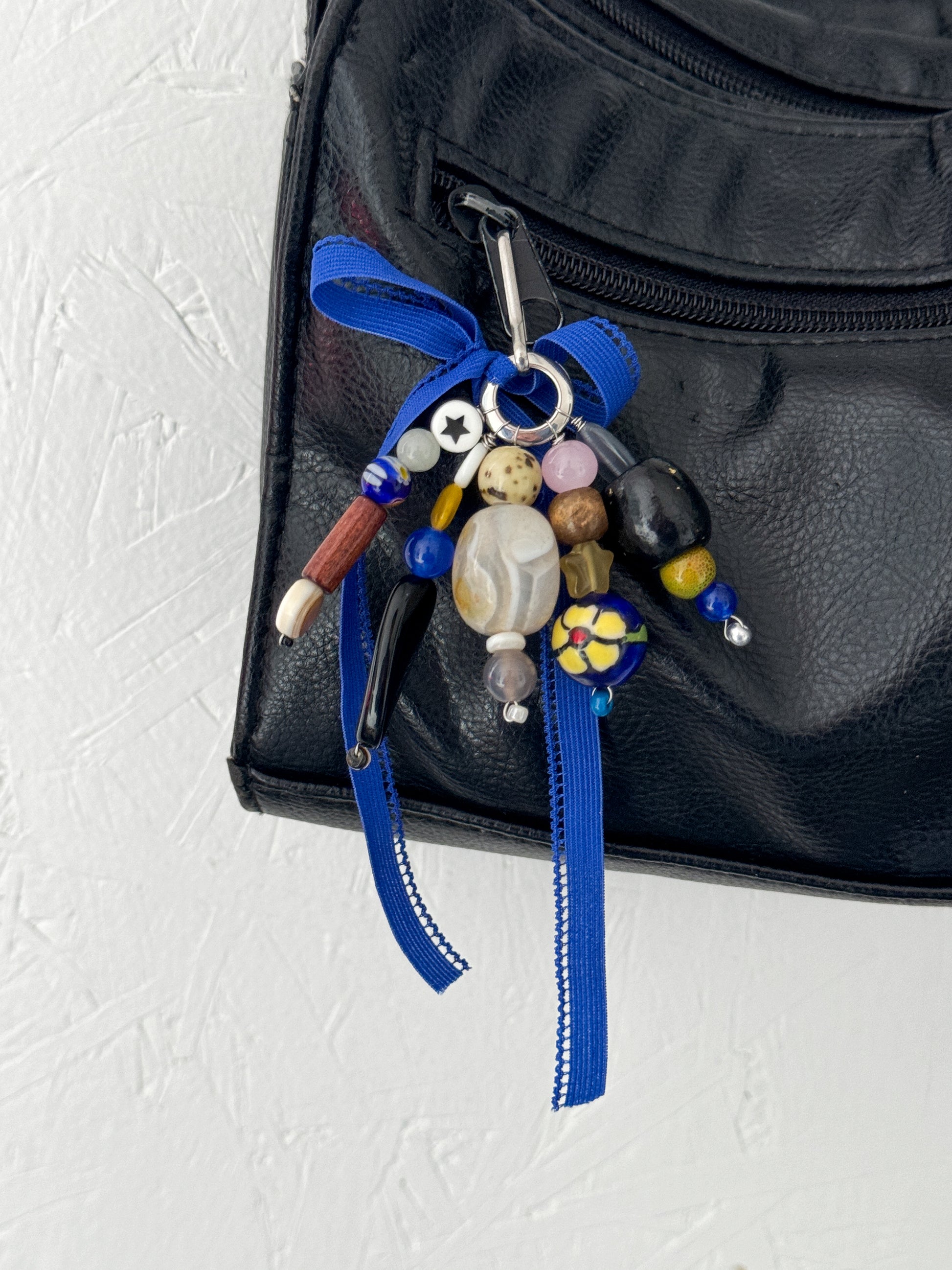 Handmade keychain/bag charm, stainless steal, wood and glass beads and ribbons of all materials.