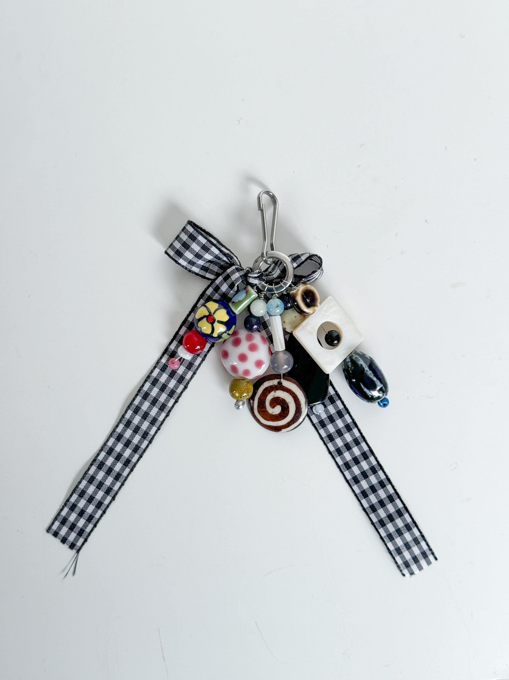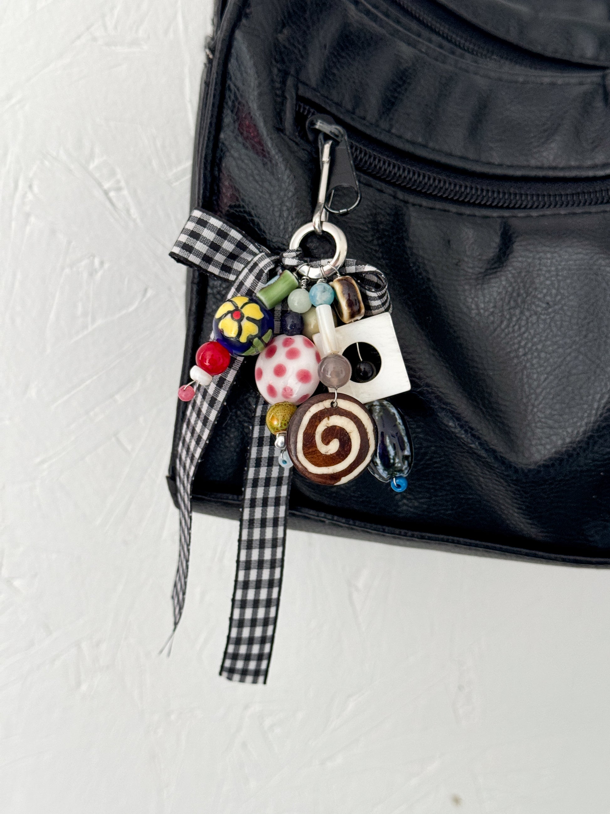 Handmade keychain/bag charm, stainless steal, wood and glass beads and ribbons of all materials.