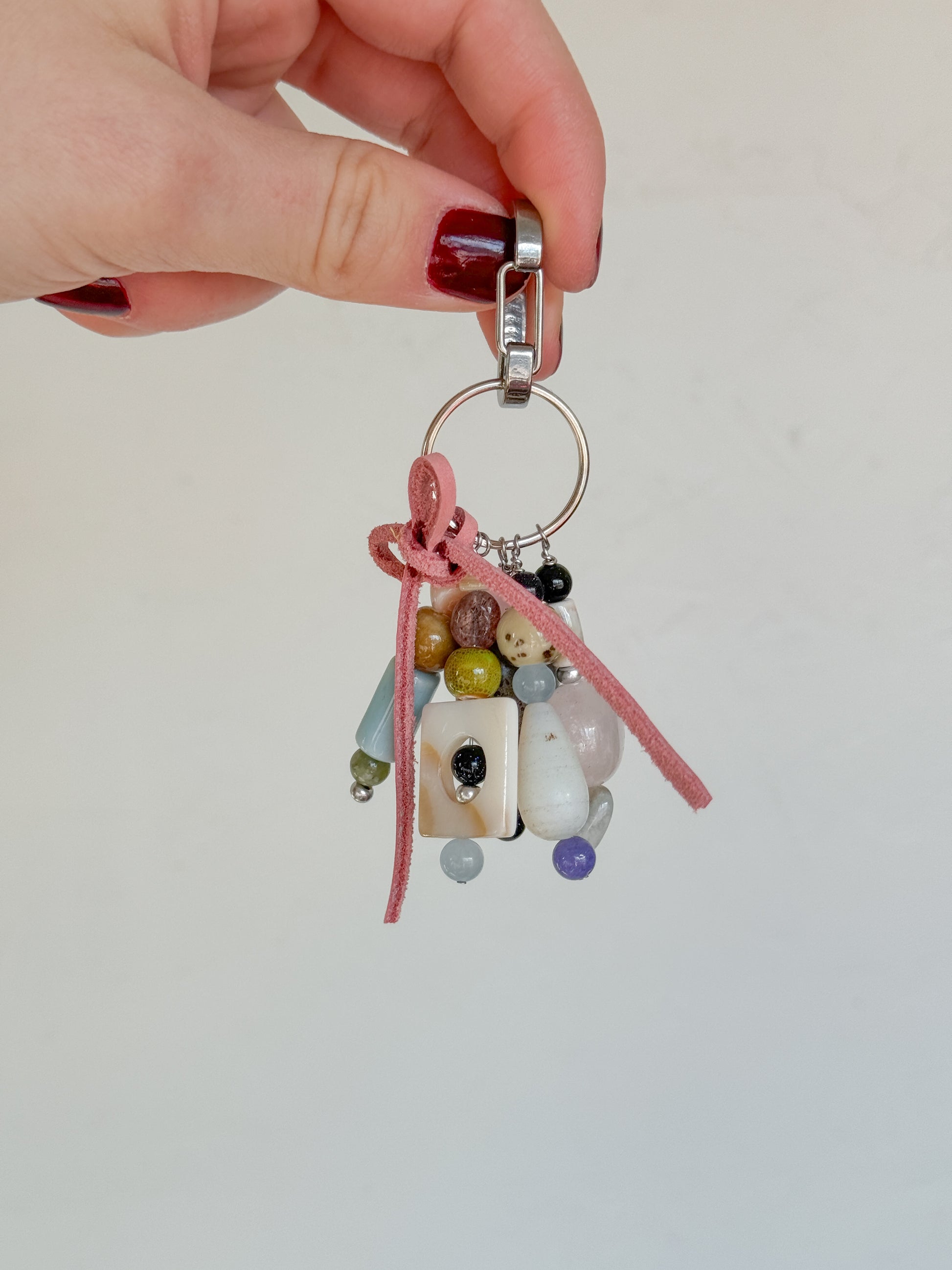 Handmade using glass & ceramic beads, leather bow and stainless steel hardware. One of a kind